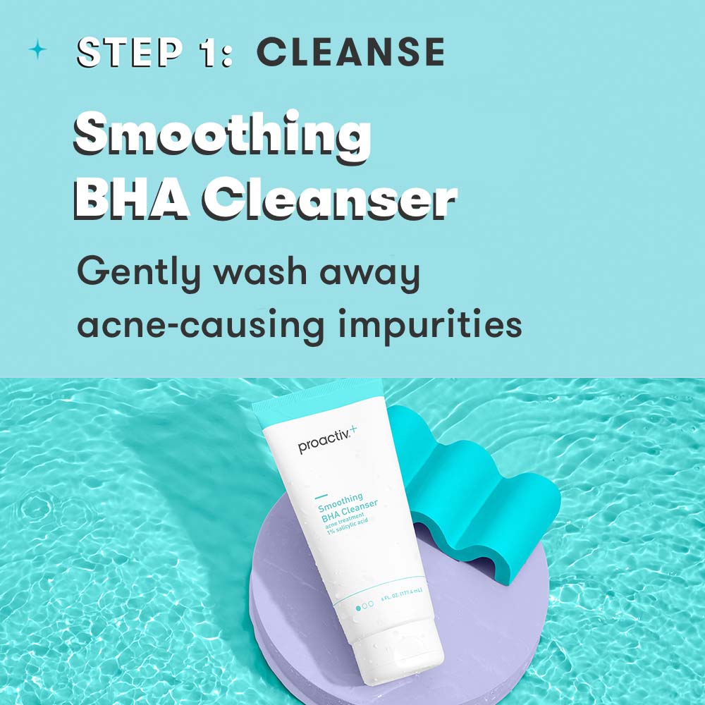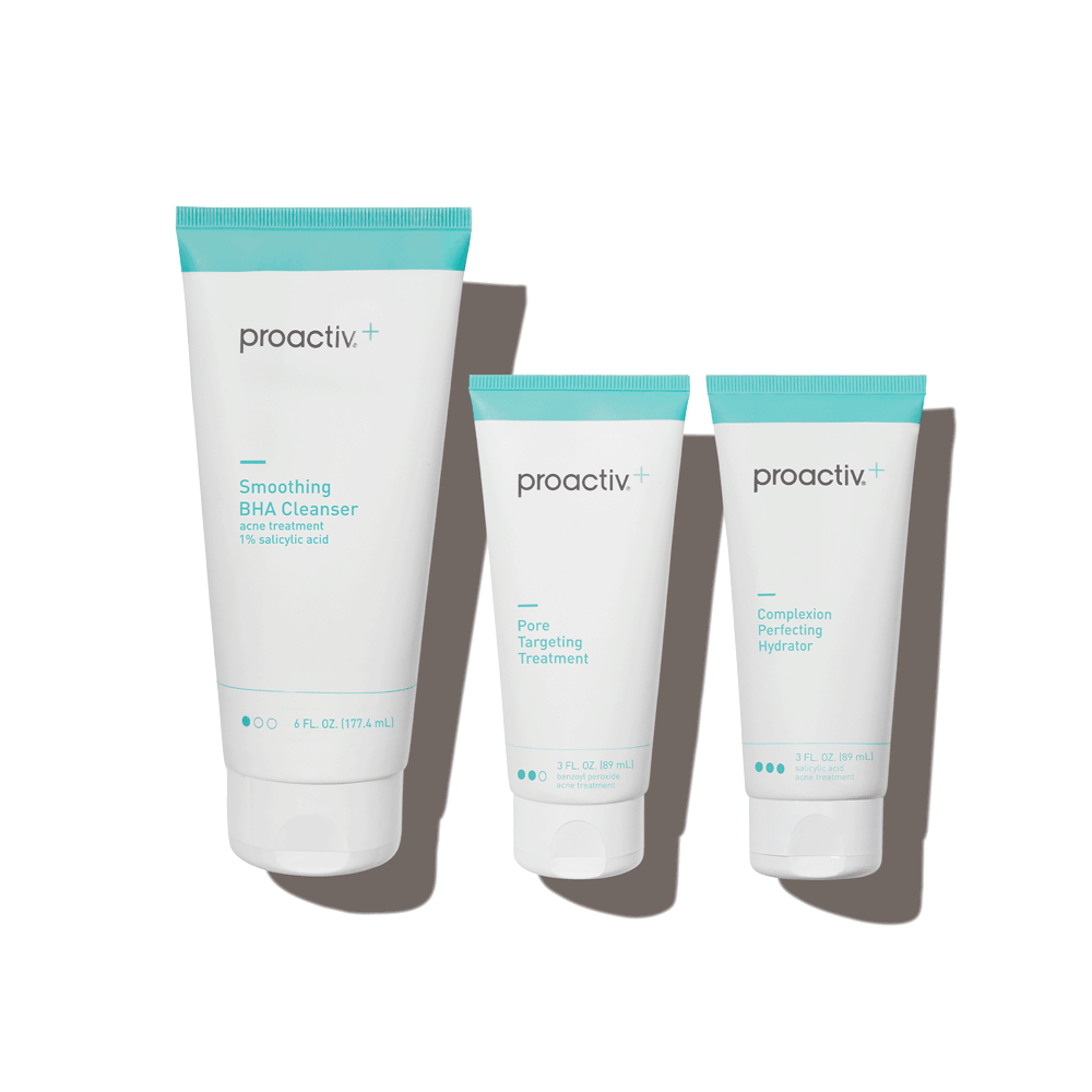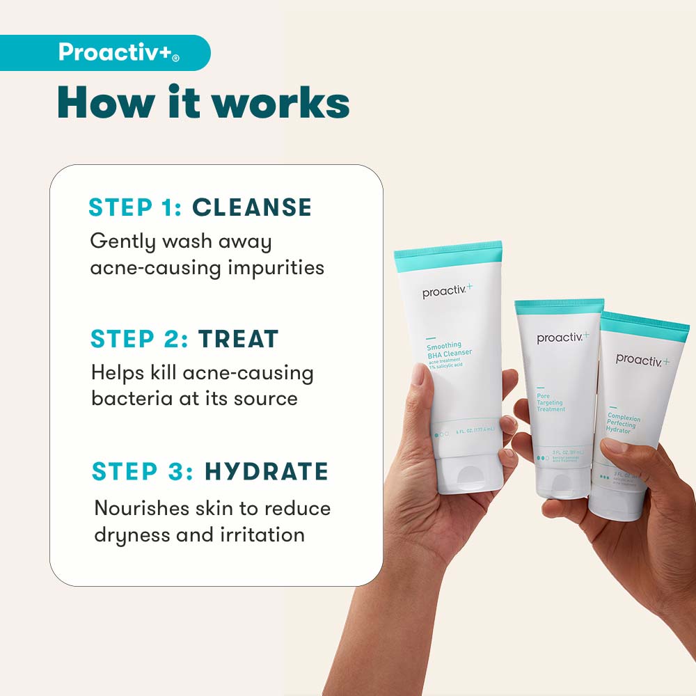 - <h6>3 easy steps, morning & night = clear, radiant skin</h6> <p>Proactiv+ is a 3-step routine designed to be used together twice a day (AM + PM) for your best results!</p> <h6>Step 1: Cleanse<br> SMOOTHING BHA CLEANSER</h6> <p>For best results: Treat your whole face twice a day, morning and night. Apply a small amount to dampened skin. Using your fingertips, gently massage in circular motions for 1 to 2 minutes. Rinse thoroughly with warm water. Pat dry and follow with Step 2 & Step 3. If going outside, follow with sunscreen.</p> <h6>Step 2: Treat<br> PORE TARGETING TREATMENT</h6> <p>For best results: Clean the skin thoroughly during Step 1 before applying this product. Cover the entire affected area with a thin layer one to three times daily. Because excessive drying of the skin may occur, start with one application daily, then gradually increase to two or three times daily if needed or as directed by a doctor. If bothersome dryness or peeling occurs, reduce application to once a day or every other day. If irritation or sensitivity develops, stop use of all products and consult a doctor before resuming. Follow with Step 3, and sunscreen if you’re going outside.</p> <h6>Step 3: Repair<br> COMPLEXION PERFECTING HYDRATOR</h6> <p>For best results: Apply Step 3 after completing Steps 1 and 2 of the Proactiv+ 3-step routine. Cover the entire affected area with a thin layer one to three times daily. Because excessive drying of the skin may occur, start with one application daily, then gradually increase to two or three times daily if needed or as directed by a doctor. If bothersome dryness or peeling occurs, reduce application to once a day or every other day. If going outside, apply sunscreen after using this product. If irritation or sensitivity develops, stop use of all products and consult a doctor before resuming.</p>