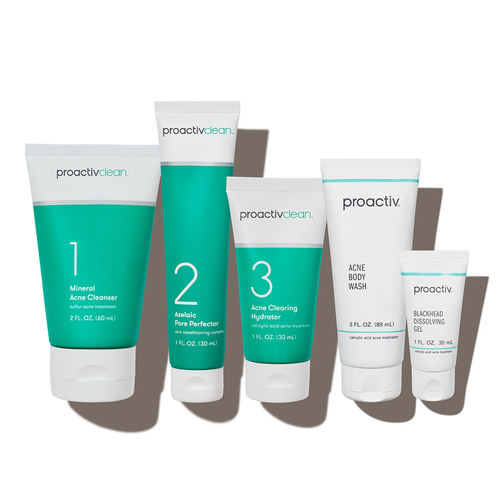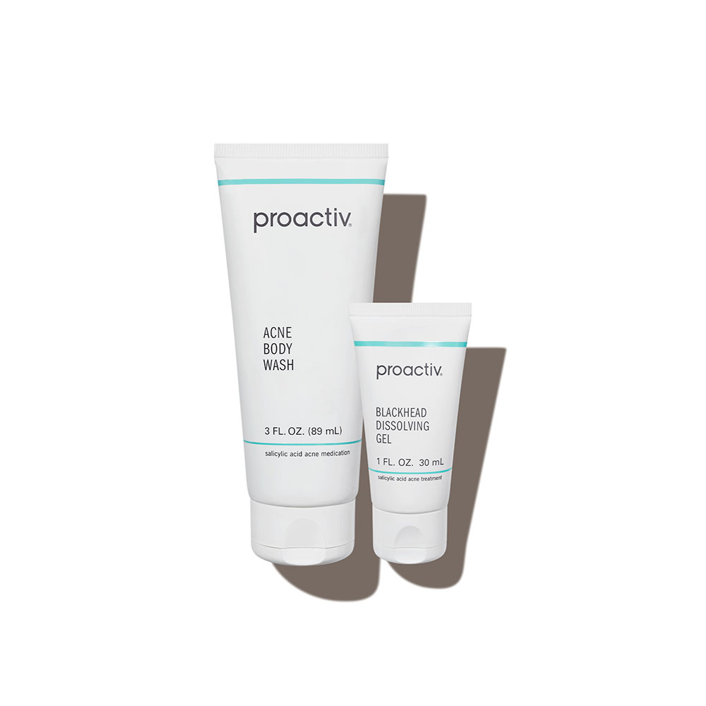- <ul> <h6>PROACTIV 3-STEP ROUTINE</h6> <li>Dermatologist developed & tested</li> <li>Non-comedogenic</li> <li>Featuring proven acne-clearing ingredients: mineral-derived sulfur and salicylic acid</li> <li>With skin-loving ingredients: azelaic acid, bakuchiol & chamomile</li> <li>Proactively formulated without: parabens, phthalates, sulfates, cyclic silicones & 100+ no-no ingredients</li> </ul> <ul> <h6>ACNE BODY WASH</h6> <li>Helps clear acne blemishes on the body</li> <li>Unclogs pores to clear and help prevent whiteheads, blackheads and future breakouts</li> <li>Aloe vera extract to help soften and soothe the skin</li> <li>Formulated with salicylic acid to encourage the shedding of dead skin cells</li> <li>Contains a soothing complex of shea butter, vitamin E, sweet almond oil and cocoa butter</li> </ul> <ul> <h6>BLACKHEAD DISSOLVING GEL</h6> <li>Helps unclog pores</li> <li>Designed to help restore softness and clarity to the skin</li> <li>Dermatologist tested</li> <li>Non-comedogenic</li> <li>Size: 1.0 oz.</li> </ul>