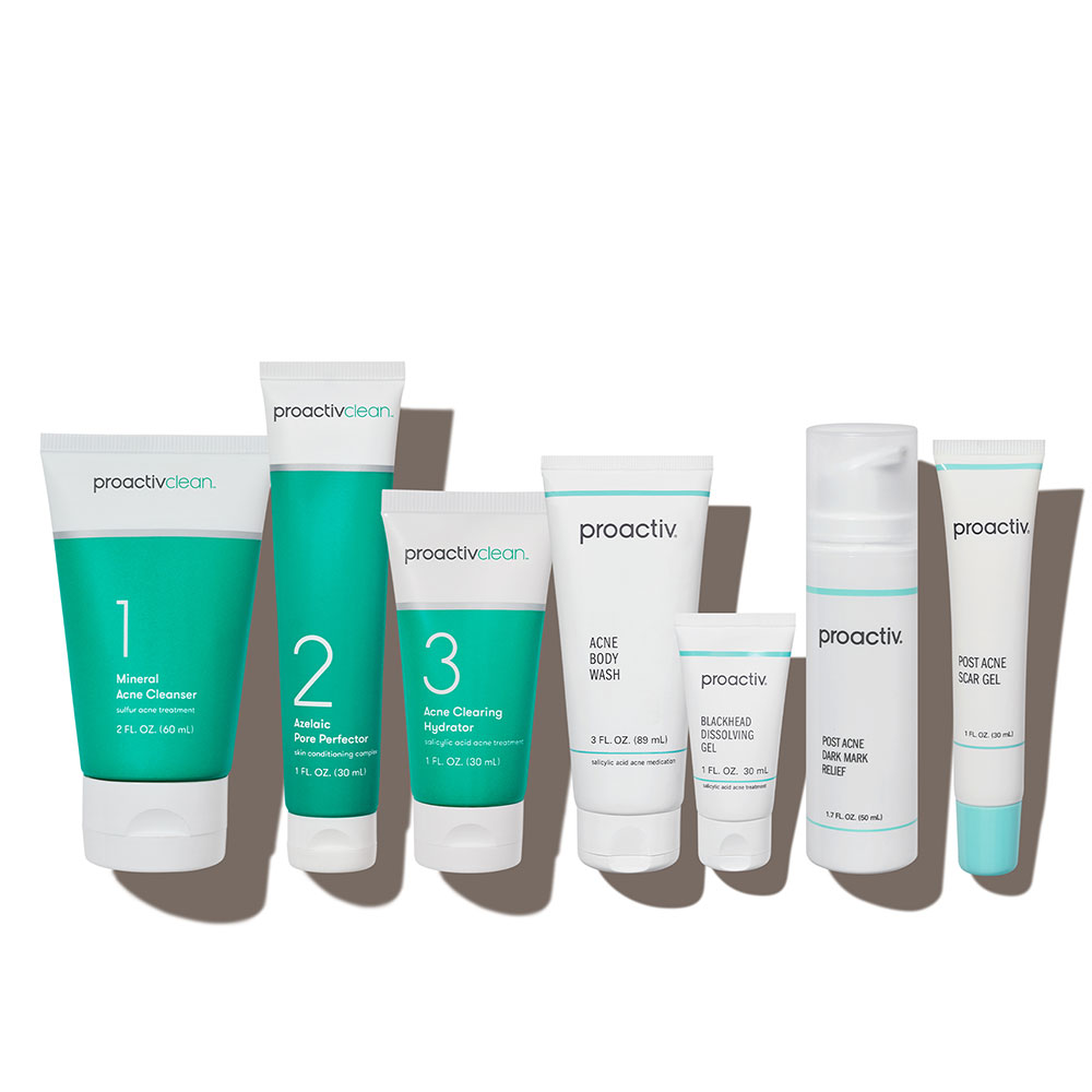 - <ul> <h6>PROACTIV 3-STEP ROUTINE</h6> <li>Dermatologist developed & tested</li> <li>Non-comedogenic</li> <li>Featuring proven acne-clearing ingredients: mineral-derived sulfur and salicylic acid</li> <li>With skin-loving ingredients: azelaic acid, bakuchiol & chamomile</li> <li>Proactively formulated without: parabens, phthalates, sulfates, cyclic silicones & 100+ no-no ingredients</li> </ul> <ul> <h6>ACNE BODY WASH</h6> <li>Helps clear acne blemishes on the body</li> <li>Unclogs pores to clear and help prevent whiteheads, blackheads and future breakouts</li> <li>Aloe vera extract to help soften and soothe the skin</li> <li>Formulated with salicylic acid to encourage the shedding of dead skin cells</li> <li>Contains a soothing complex of shea butter, vitamin E, sweet almond oil and cocoa butter</li> </ul> <ul> <h6>BLACKHEAD DISSOLVING GEL</h6> <li>Helps unclog pores</li> <li>Designed to help restore softness and clarity to the skin</li> <li>Dermatologist tested</li> <li>Non-comedogenic</li> <li>Size: 1.0 oz.</li> </ul> <ul> <h6>POST ACNE DARK MARK RELIEF</h6> <li>A moisturizer that helps to reduce the appearance of post acne dark marks</li> <li>Helps improve the appearance of skin redness by nourishing the skin</li> <li>Helps even skin tone</li> <li>Formulated with antioxidants and skin conditioning ingredients</li> <li>Hydrates the skin</li> <li>Hydroquinone free</li> </ul> <ul> <h6>POST ACNE SCAR GEL</h6> <li>Clinically shown to gently resurface skin and to smooth rough, textured skin</li> <li>Clinically shown to reduce the appearance of uneven texture and significantly improve skin’s smoothness</li> <li>Improve the appearance of post-acne scars & pores</li> <li>Designed for old and new acne scars</li> <li>Reinforces the skin’s moisture barrier</li></ul>