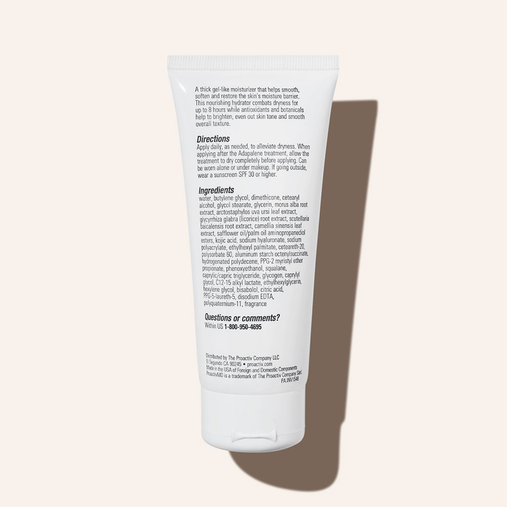 - <li>Moisturizes for up to 8 hours to alleviate dryness</li> <li>Restores skin's moisture barrier</li> <li>Reduces the appearance of redness and sensitivity that result from dry skin</li> <li>Silky rich, gel-like texture</li> <li>Absorbs excess oil, mattifying skin and giving it a smoother appearance</li> <li>Includes a brightening complex to help even skin tone and fade the appearance of post-acne dark marks</li> <li>Formulated especially for acne prone skin as part of the ProactivMD skincare system</li> <p>
