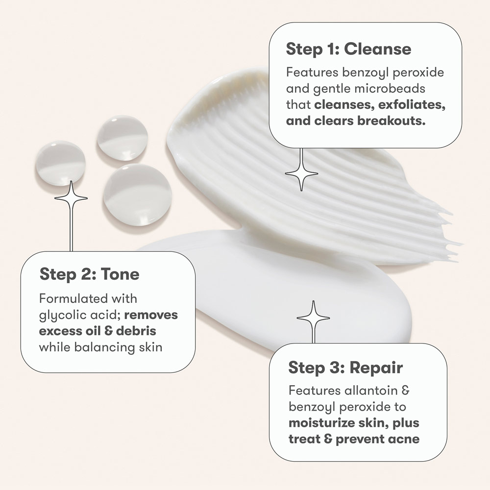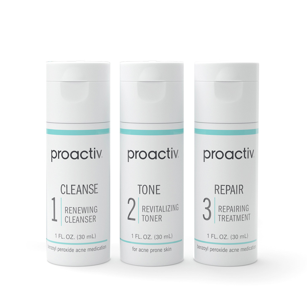 - <li>Trial sizes: Perfect for trying the routine for the first time or gifting </li> <li>Travel-friendly & TSA-approved: Bring your acne routine on-the-go, for whenever you need to stop a breakout. </li> <li>Includes a face wash, toner, and treatment: Each step builds on the step before, attacking the acne cycle to clear blemishes and help prevent new ones from forming.</li> <li>Renewing Cleanser removes impurities, helps clear breakouts, and gently exfoliates </li> <li>Revitalizing Toner balances skin's natural oils, purifies pores, and removes debris </li> <li>Repairing Treatment is a lightweight, all-over formula that treats your active acne and prevents future breakouts</li>