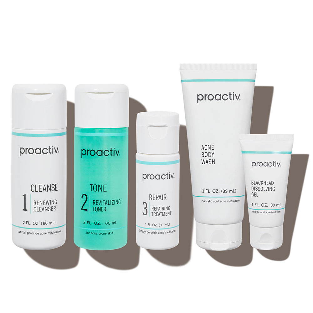 - <ul> <h6>PROACTIV 3-STEP SYSTEM</h6> <li>This Proactiv 3-Step System revolutionized the treatment of acne</li> <li>Each step builds on the step before, attacking the acne cycle to clear current blemishes and help prevent new ones from forming</li> <li>The Proactiv 3-Step System features advanced micro-crystal benzoyl peroxide—designed to work faster and gentler than ever before</li> </ul> <ul> <h6>ACNE BODY WASH</h6> <li>Helps clear acne blemishes on the body</li> <li>Unclogs pores to clear and help prevent whiteheads, blackheads and future breakouts</li> <li>Aloe vera extract to help soften and soothe the skin</li> <li>Formulated with salicylic acid to encourage the shedding of dead skin cells</li> <li>Contains a soothing complex of shea butter, vitamin E, sweet almond oil and cocoa butter</li> </ul> <ul> <h6>Blackhead Dissolving Gel</h6> <li>Helps unclog pores</li> <li>Designed to help restore softness and clarity to the skin</li> <li>Dermatologist tested</li> <li>Non-comedogenic</li> <li>Size: 1.0 oz.</li> </ul>