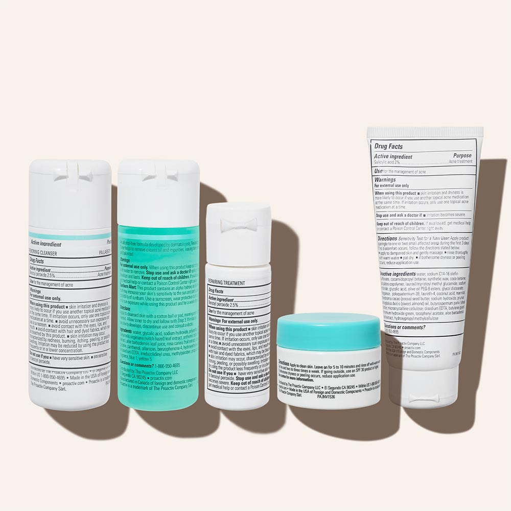 - <h6>RENEWING CLEANSER</h6> <p>Active Ingredient: Benzoyl Peroxide, 2.5% Inactive Ingredients: Water, Magnesium Aluminum Silicate, Glyceryl Stearate, PEG-100 Stearate, Sorbitol, Dimethyl Isosorbide, Disodium PEG-12 Dimethicone Sulfosuccinate, Tridecyl Stearate, Neopentyl Glycol Dicaprylate/Dicaprate, Paraffin, Cetyl Esters, Anthemis Nobilis Flower Extract, Tridecyl Trimellitate, Trisodium Sulfosuccinate, PEG-12 Dimethicone, Sodium Sulfate, Sodium Hyaluronate, Propylene Glycol, Sodium PCA, Xanthan Gum, Phenoxyethanol, Imidazolidinyl Urea, Methylparaben, Propylparaben, Fragrance</p> <h6>REVITALIZING TONER</h6> <p>Ingredients: water, glycolic acid, sodium hydroxide, polysorbate 20, hamamelis virginiana (witch hazel) leaf extract, anthemis nobilis flower extract, aloe barbadensis leaf juice, rosa = canina fruit extract, sodium PCA, glycerin, panthenol, allantoin, benzophenone-4, hydroxyethylcellulose, tetrasodium EDTA, imidazolidinyl urea, methylparaben, propylparaben, fragrance, blue 1, yellow 5</p> <h6>REPAIRING TREATMENT</h6> <p>Active Ingredient: Benzoyl Peroxide, 2.5% Inactive Ingredients: water, ethoxydiglycol, cyclotetrasiloxane, cyclopentasiloxane, propylene glycol, cetearyl alcohol, dimethicone, glyceryl stearate, PEG-100 stearate, panthenol, allantoin, xanthan gum, ceteareth-20, carbomer, sodium hydroxide, diazolidinyl urea, methylparaben, propylparaben, fragrance</p> <h6>ACNE BODY WASH</h6> <p>Active Ingredients: salicylic acid 2% Inactive Ingredients: acrylates copolymer, aloe barbadensis leaf extract, butylene glycol, butyrospermum parkii (shea) butter, chromium hydroxide green, citric acid, cocamidopropyl betaine, coco-betaine, coconut acid, disodium EDTA, fragrance, glycerin, glycol distearate, glycolic acid, hydroxypropyl methylcellulose, laureth-4, lauroyl/myristoyl methyl glucamide, mannitol, microcrystalline cellulose, olive oil PEG-8 esters, polyquaternium-39, prunus amygdalus dulcis (sweet almond) oil, sodium C14-16 olefin sulfonate, sodium chloride, sodium hydroxide, synthetic wax, theobroma cacao (cocoa) seed butter, tocopheryl acetate, water</p> <h6>AMAZONIAN CLAY MASK</h6> <p>Ingredients: water, kaolin (mineral, amazonian white clay), glycerin, petrolatum, cetearyl alcohol, propanediol, stearyl alcohol, bentonite, PEG-100 stearate, glyceryl stearate, butyrospermum parkii (shea) butter, magnesium aluminum silicate, pyrus malus (apple) fruit extract, persea gratissima (avocado) oil, xanthan gum, sorbitan stearate, phenoxyethanol, caprylyl glycol, cucumis sativus (cucumber) seed oil, hexylene glycol, ethylhexylglycerin, citric acid, glyceryl acrylate/acrylic acid copolymer</p>