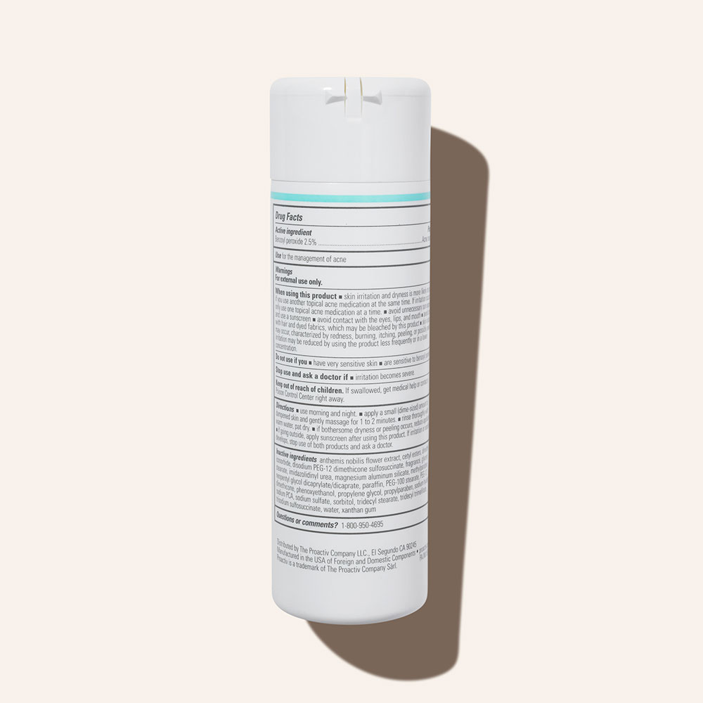 - <p>Active Ingredient: benzoyl peroxide 2.5%</p> <p>Inactive Ingredients: anthemis nobilis flower extract, cetyl esters, dimethyl isosorbide, disodium PEG-12 dimethicone sulfosuccinate, fragrance, glyceryl stearate, imidazolidinyl urea, magnesium aluminum silicate, methylparaben, neopentyl glycol dicaprylate/dicaprate, paraffin, PEG-100 stearate, PEG-12 dimethicone, phenoxyethanol, propylene glycol, propylparaben, sodium hyaluronate, sodium PCA, sodium sulfate, sorbitol, tridecyl stearate, tridecyl trimellitate, trisodium sulfosuccinate, water, xanthan gum</p>