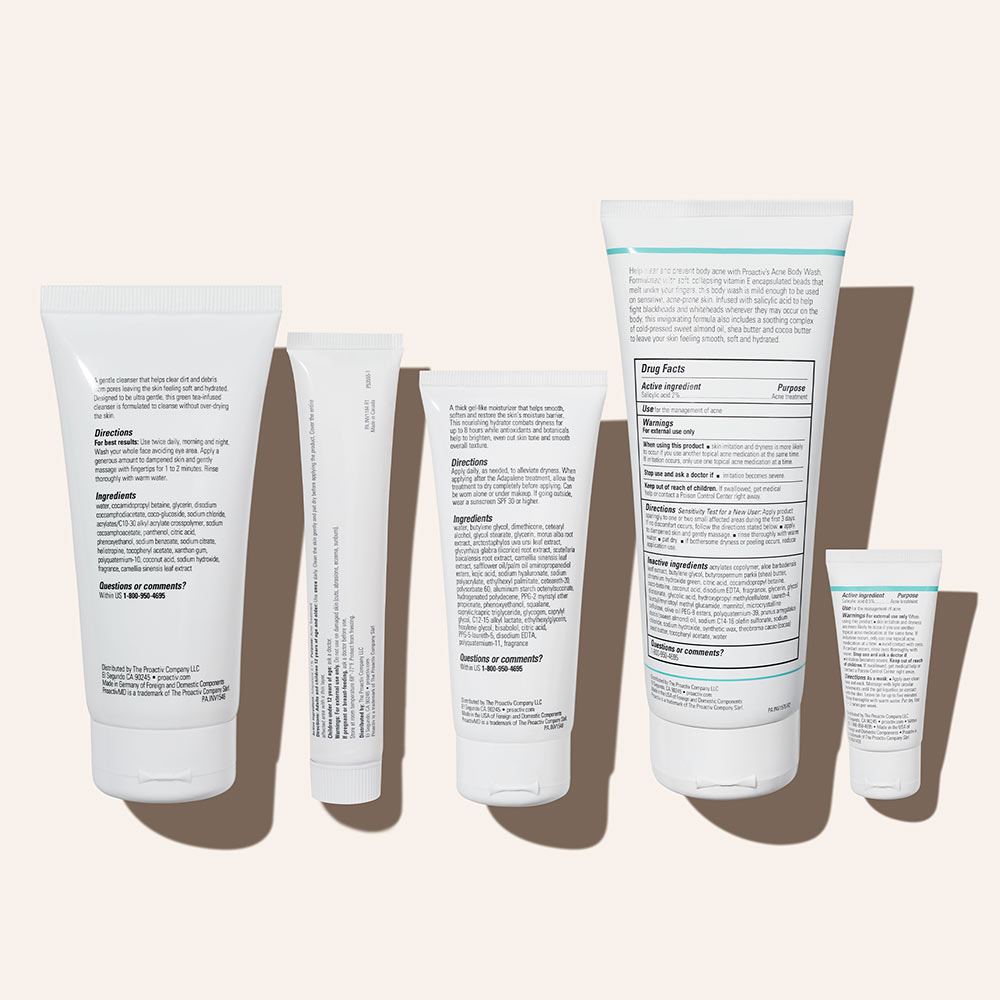 - <h6>Ultra-Gentle Cleanser</h6> <p>Water, cocamidopropyl betaine, glycerin, disodium cocoamphodiacetate, coco-glucoside, sodium chloride, acrylates/c10-30 alkyl acrylate crosspolymer, sodium cocoamphoacetate, panthenol, citric acid, phenoxyethanol, sodium benzoate, sodium citrate, heliotropine, tocopheryl acetate, xanthan gum, polyquaternium-10, coconut acid, sodium hydroxide, fragrance, camellia sinensis leaf extract.</p> <h6>Adapalene Gel</h6> <p>Active Ingredient: Adapalene 0.1% (retinoid)*<br> Inactive Ingredients: carbomer, edetate disodium, phenoxyethanol, poloxamer 182, propylene glycol, sodium hydroxide, water</p> <h6>Ultra-Hydrating Moisturizer</h6> <p>Water, butylene glycol, dimethicone, cetearyl alcohol, glycol stearate, glycerin, morus alba root extract, arctostaphylos uva ursi leaf extract, glycyrrhiza glabra (licorice) root extract, scutellaria baicalensis root extract, camellia sinensis leaf extract, safflower oil/palm oil aminopropanediol esters, kojic acid, sodium hyaluronate, sodium polyacrylate, ethylhexyl palmitate, ceteareth-20, polysorbate 60, aluminum starch octenylsuccinate, hydrogenated polydecene, PPG-2 myristyl ether propionate, phenoxyethanol, squalane, caprylic/capric triglyceride, glycogen, caprylyl glycol, c12-15 alkyl lactate, ethylhexylglycerin, hexylene glycol, bisabolol, citric acid, PPG-5-laureth-5, disodium EDTA, polyquaternium-11, fragrance</p> <h6>Acne Body Wash</h6> <p>Active Ingredients: salicylic acid 2%<br> Inactive Ingredients: acrylates copolymer, aloe barbadensis leaf extract, butylene glycol, butyrospermum parkii (shea) butter, chromium hydroxide green, citric acid, cocamidopropyl betaine, coco-betaine, coconut acid, disodium EDTA, fragrance, glycerin, glycol distearate, glycolic acid, hydroxypropyl methylcellulose, laureth-4, lauroyl/myristoyl methyl glucamide, mannitol, microcrystalline cellulose, olive oil PEG-8 esters, polyquaternium-39, prunus amygdalus dulcis (sweet almond) oil, sodium C14-16 olefin sulfonate, sodium chloride, sodium hydroxide, synthetic wax, theobroma cacao (cocoa) seed butter, tocopheryl acetate, water</p> <h6>Blackhead Dissolving Gel</h6> <p>Active Ingredient: salicylic acid, 0.5%</p> <p>Inactive Ingredients: aloe barbadensis leaf juice, bisabolol, butyl methoxydibenzoylmethane, butyrospermum parkii (shea) butter, camellia sinensis leaf extract, caprylyl glycol, cyclohexasiloxane, cyclopentasiloxane, dimethicone, dimethiconol, ethylhexyl methoxycinnamate, ethylhexyl salicylate, ethylhexylglycerin, fragrance, glycereth-26, glycerin, hexylene glycol, lactic acid, panthenol, PEG-40 hydrogenated castor oil, PEG-80 sorbitan laurate, phenoxyethanol, polyacrylate-13, polyisobutene, polysorbate 20, PPG-26-buteth-26, water.</p>