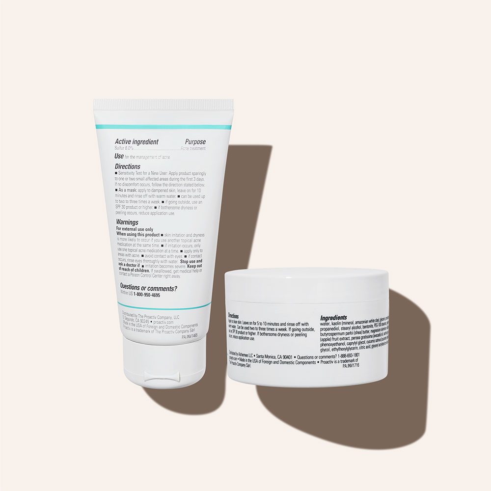 - <h6>Proactiv Skin Purifying Mask</h6> <p> Active Ingredient: Sulfur 6% </p> <p>Inactive Ingredients: butylene glycol, ceteareth-20, cetearyl alcohol, chromium hydroxide green, cymbopogon schoenanthus extract, ethoxydiglycol, fragrance, geranium maculatum extract, glycereth-26, hydrated silica, kaolin, linoleic acid, linolenic acid, magnesium aluminum silicate, melaleuca alternifolia (tea tree) leaf oil, paraffin, phenoxyethanol, sodium lauroyl sarcosinate, titanium dioxide, tocopheryl acetate, water, zinc oxide</p> <h6>Amazonian Clay Mask</h6> <p>Ingredients: water, kaolin (mineral, amazonian white clay), glycerin, petrolatum, cetearyl alcohol, propanediol, stearyl alcohol, bentonite, PEG-100 stearate, glyceryl stearate, butyrospermum parkii (shea) butter, magnesium aluminum silicate, pyrus malus (apple) fruit extract, persea gratissima (avocado) oil, xanthan gum, sorbitan stearate, phenoxyethanol, caprylyl glycol, cucumis sativus (cucumber) seed oil, hexylene glycol, ethylhexylglycerin, citric acid, glyceryl acrylate/acrylic acid copolymer</p>