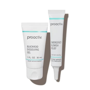 - <h6> Proactiv Emergency Blemish Relief </h6> <ul> <li>Contains an extra dose of acne fighting prescription-grade, Benzoyl Peroxide (5%)</li> <li>Perfect for on-the-go spot treatment</li> <li>Designed to unclog pores</li> <li>Specially formulated to help absorb excess oil and clear emergency blemishes fast</li> <li>Penetrates deep into the pores to help prevent new blemishes from forming</li> <li>Non-comedogenic</li> <li>Dermatologist tested</li> <li>Size: 0.33 oz</li> </ul> <h6> Proactiv Blackhead Dissolving Gel </h6> <ul> <li>Helps unclog pores</li> <li>Designed to help restore softness and clarity to the skin</li> <li>Dermatologist tested</li> <li>Non-comedogenic</li> <li>Size: 1.0 oz.</li> </ul>